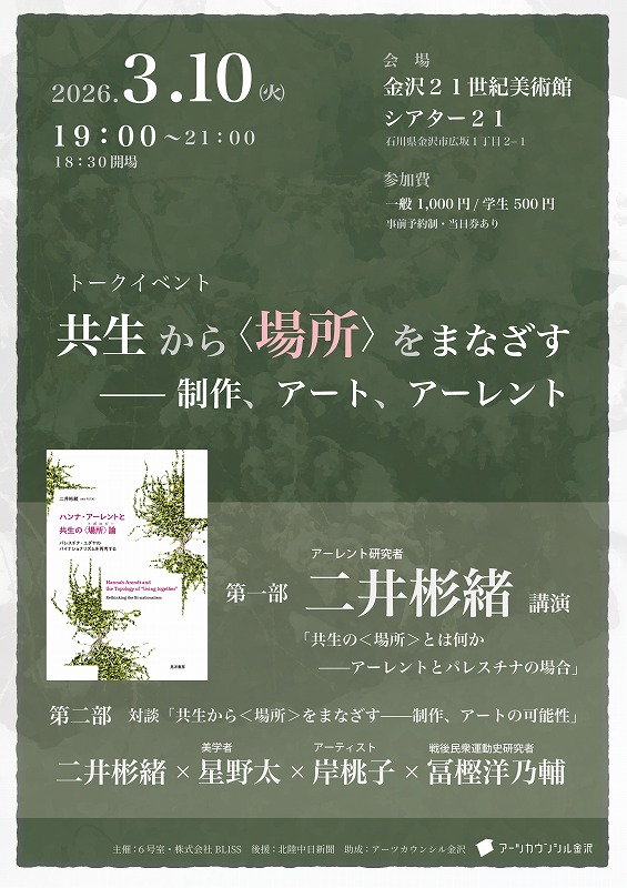 第二部ではアーレントが目指した共生の<場所>を可視化するための制作、アートが果たす役割は何か――。アーレント代表作『人間の条件』の中で考察された3つの行為様式 - labor労働・work制作・action活動 - そのなかで近年その重要性が注目されている[制作]に焦点を当て、ファシリテーター星野太さん、ゲスト岸桃子さん・冨樫洋乃輔さんと共に、金沢・近郊での実践例を交えながら思索を深めます。