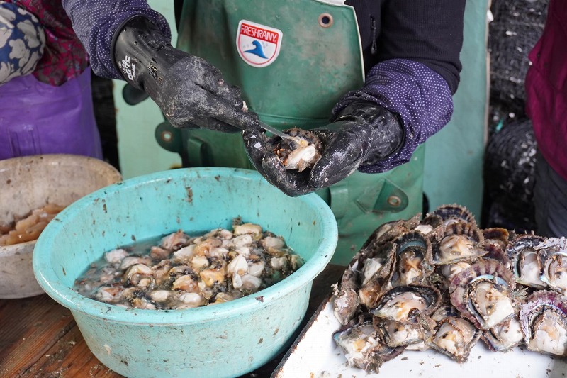 昼食が終わると昼前には弱くなっていた雨も上がり、作業再開。そばで(邪魔にならないよう)見学させてもらう。みなとにかく作業が早い。ヘラのようなナイフであっという間に貝を開け、貝柱と身を切り剥がして、最後に貝柱を貝殻から切り落とす。