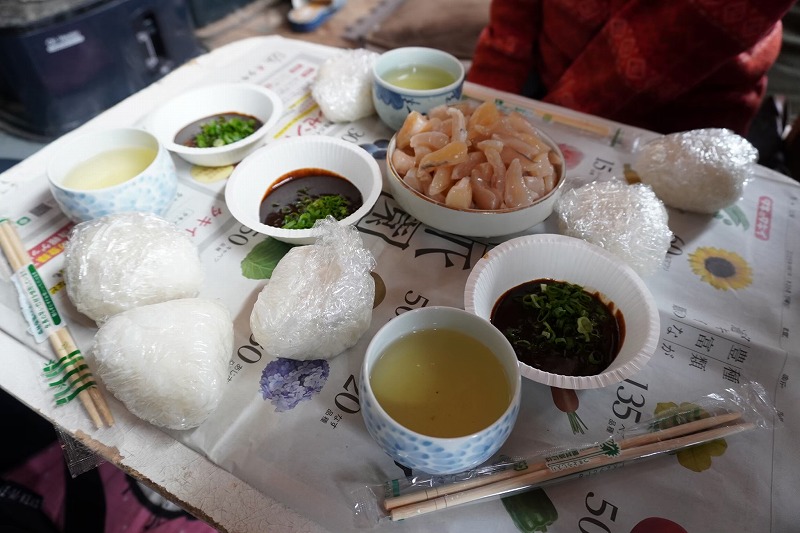 貝剥きとはその名の通り、アコヤ貝を剥いて身から真珠を取り出す作業だ。その際、貝柱は剥き分けて、きれいに洗った後、いただく。貝剥きの時期のときだけ食べられる知られざる珍味。新鮮な貝柱は酢味噌と小葱をかけて生食としていただくのがYさん流の食べ方で、コリコリと触感もあり、美味しい。ご飯(白飯)はみな持参で、わたしたちも朝お宿で炊いたご飯をおにぎりにして持っていった。アコヤ貝が海の脅威からその身を守るために貝柱が踏ん張って貝の開閉動力を担っていることを、文字通り噛みしめながら実感した。