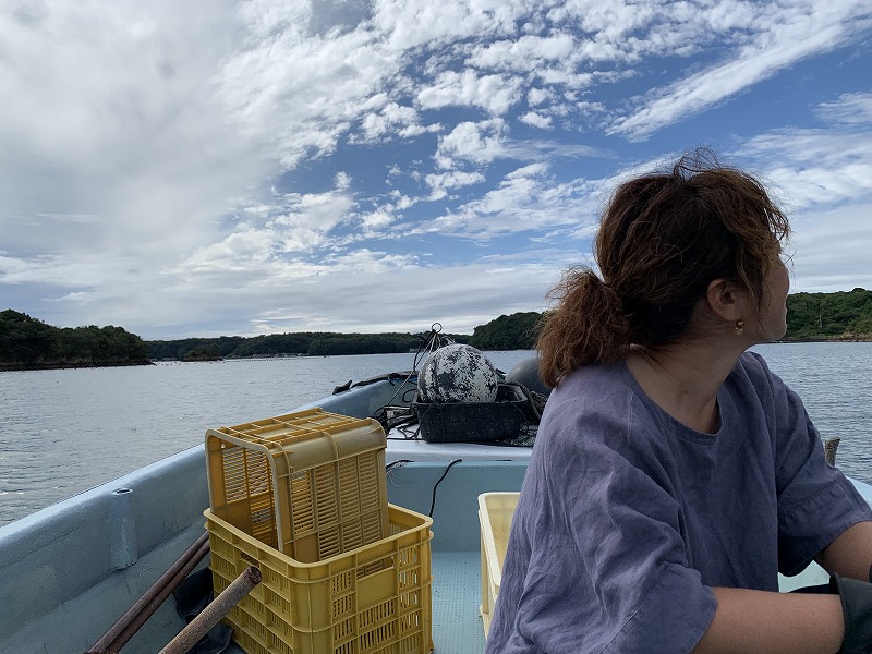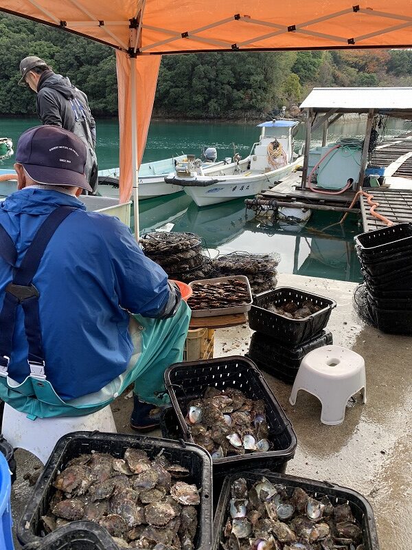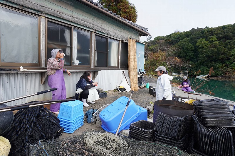 急いで駐車場へと駆け下り、養殖所のある船越地区へ。車一台しか通れないであろう藪に覆われた細い道を2-3分ほど降りていくと急に視界が開けてくる。海だ。車を停めて急いでレインウェアと長靴に履き替え、初っ端からご迷惑をお掛けして申し訳ない気持ちで走っていくと、Yさんは何事もなかったように朗らかな笑顔で迎えてくれた。午前中の作業が終わって、これから昼ごはんだから中に入っててと促された。