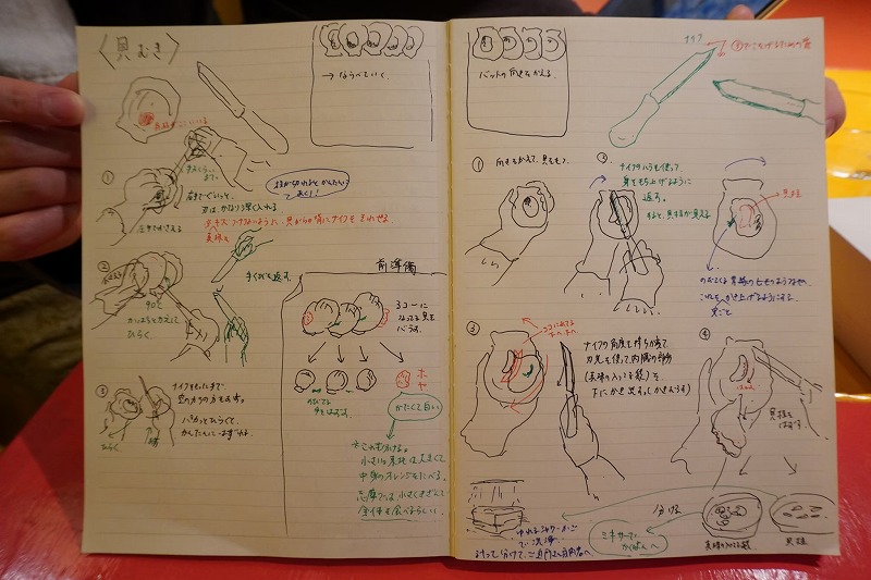 そのうちにYさんが「やってみる?」と貝剥き作業を教えていただくことに。教えてくれたのはYさん長女で大学生のHちゃん。9歳のときから手伝っているという彼女のナイフ裁きはベテランの域。貝剥きは大まかに①貝を剥いて開ける、②身と貝柱を剥きわける工程がある。ナイフと貝の持ち方から教わり、先ずは①、身のなかにある真珠を傷つないように貝にナイフを入れて、貝を剥くのをゆっくりと見せてくれる。恐る恐るやってみる。見よう見まねで貝は剥けるのだが、身がぐにゃりとしてしまう。Hちゃんが剥くと身の表面はぷるぷるしたまま。ナイフが貝と身のスキマに入り込んでいる証拠だ。三崎さんもOさんも一緒に貝を剥く。おふたりとも作家とあって手先はたいへん器用なのだが、とくにOさんの習得は早かった。隣にいたYさんの従姉(おなじく真珠養殖が家業)は「わたしよりも本当に上手」と何度も口にし、Oさんの作業スピードと精度は他のみなさんとさほど変わらないレベルへと上達していた。