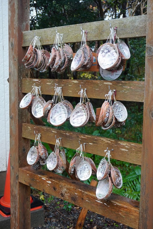 次の朝は予報通り雨。前日Yさんからの電話で「わたしたちは朝6時半から沖から真珠を揚げにいっているけれど、そんなに早くきてもらっても困るからゆっくりでいいよ」と聞いていたので、観光がてら大王﨑灯台へ。雨が止む気配は一向になかったが、せっかくなので波切神社まで足を伸ばした。かつて捕鯨が行われていた波切では解体したクジラの内臓から大きな卵型の石が出てきて、畏れた漁師たちが波切神社に鯨石として祀ったという記録があり、今回の展示ではアンバーグリスを使った香水をつくろうと決めていたわたしは鯨石にも興味津々だった。