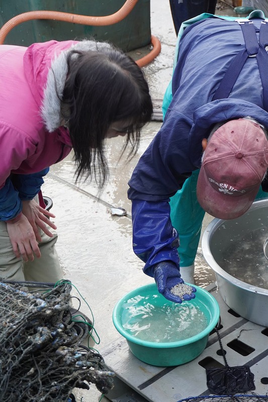 洗い流した身の部分はそのまま海へ。魚やプランクトンのよい餌になるそうだ。ついさっきまで生きていたアコヤ貝のいのちと真珠をいただき、海に還すものは海へお還しする。SDGsが声高に叫ばれる昨今だが、ここにはずっと前から、脈々と受け継がれてきた循環する営みがある。お父さんが取り出した真珠を布袋に入れる。ひとと海が長い年月をかけて育んだ大切な宝が詰まっている。