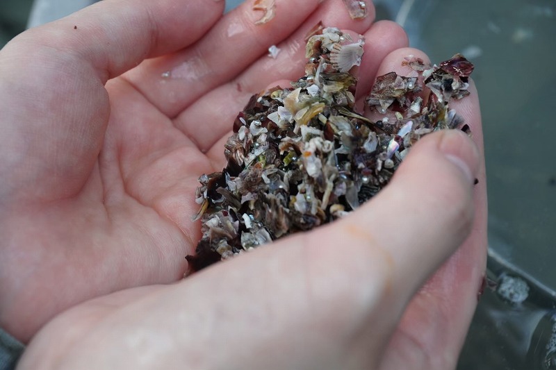 みなが貝剥きに励んでいる傍らで、Yさんのお父さんは身から真珠を選り分ける作業を繰り返し行っていた。撹拌機に集められた身と、粘り気をとるための石灰水を投入して、粉砕する。出てきた乳白色のどろどろした液体を今度は水槽に移して海水を流し込んでいくと真珠は水槽の底に沈んでいく。いろんな形、いろんな色をした真珠がある。真円の真珠はごくわずかだ。真珠を選り分けたあとの貝片にはザルの網にもかからないケシ(核がない真珠)が混ざり込んでいる。貝剥き作業が終わった後日、お母さんが丁寧に選り分けるのだそう。